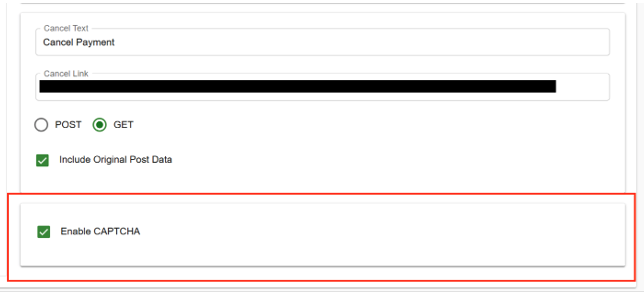 On the Elavon Portal Payment Page, locate teh CAPCHA configuration option and confirm that it is enabled